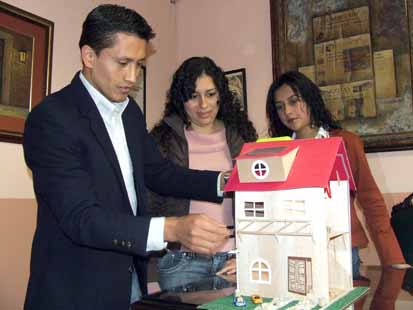 José Bacuilima, representante del proyecto, muestra en una maqueta el funcionamiento del aparato que desarrollaron. Foto El Mercurio