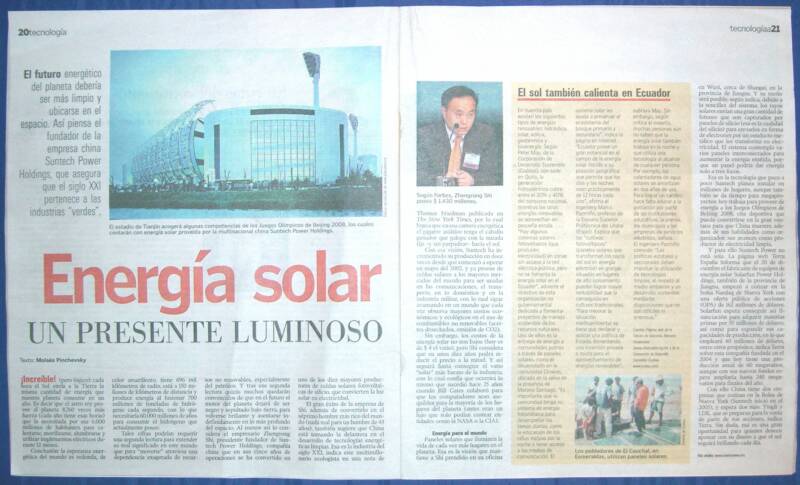 Tales cifras podrían requerir una segunda lectura para entender su real significado en este mundo que para "moverse" atraviesa una dependencia exagerada de recursos no renovables, especialmente del petróleo. Y tras esa segunda lectura quizás muchos quedarán convencidos de que en el futuro el motor del planeta dejará de ser negro y sepultado bajo tierra, para volverse brillante y asentarse indefinidamente en lo más profundo del espacio. Al menos así lo considera el empresario Zhengrong Shi, presidente fundador de Suntech Power Holdings, compañía china que en sus cinco años de operaciones se ha convertido en uno de los diez mayores productores de celdas solares fotovoltaicas de silicio, que convierten la luz solar en electricidad.