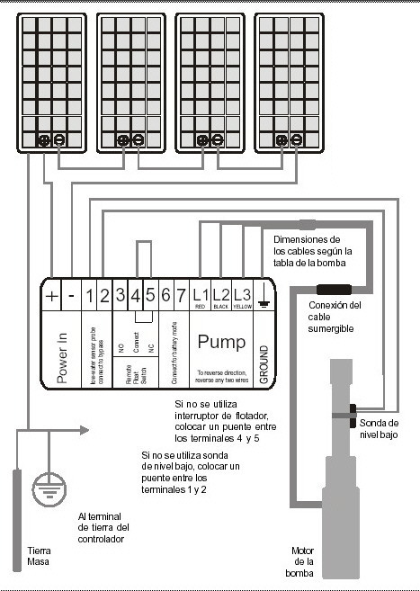 - Los cuatro cables (3 fases + tierra) entre el controlador y la bomba nunca deben ser interrumpidos, esto puede causar el daño del controlador y/o del motor de la bomba.